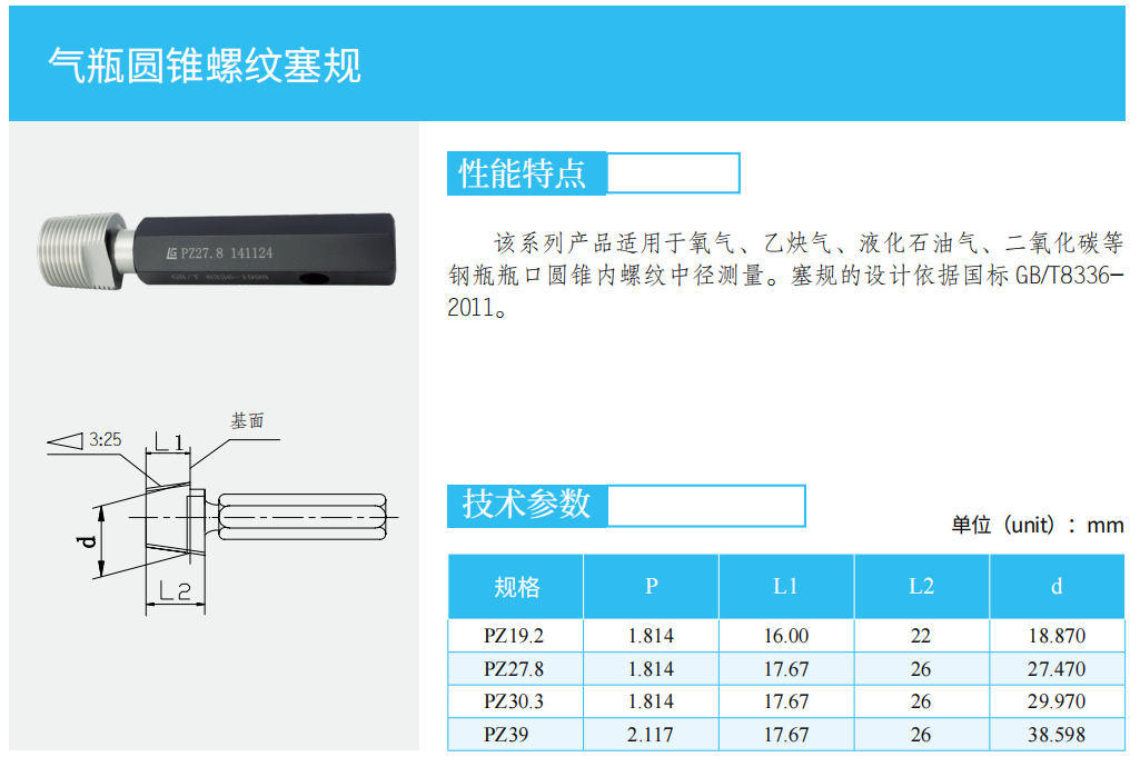 該系列產(chǎn)品適用于氧氣、乙炔氣、液化石油氣、二氧化碳等鋼瓶瓶口圓錐內(nèi)螺紋中徑測(cè)量。塞規(guī)的設(shè)計(jì)依據(jù)國(guó)標(biāo)GBT8336-2011.