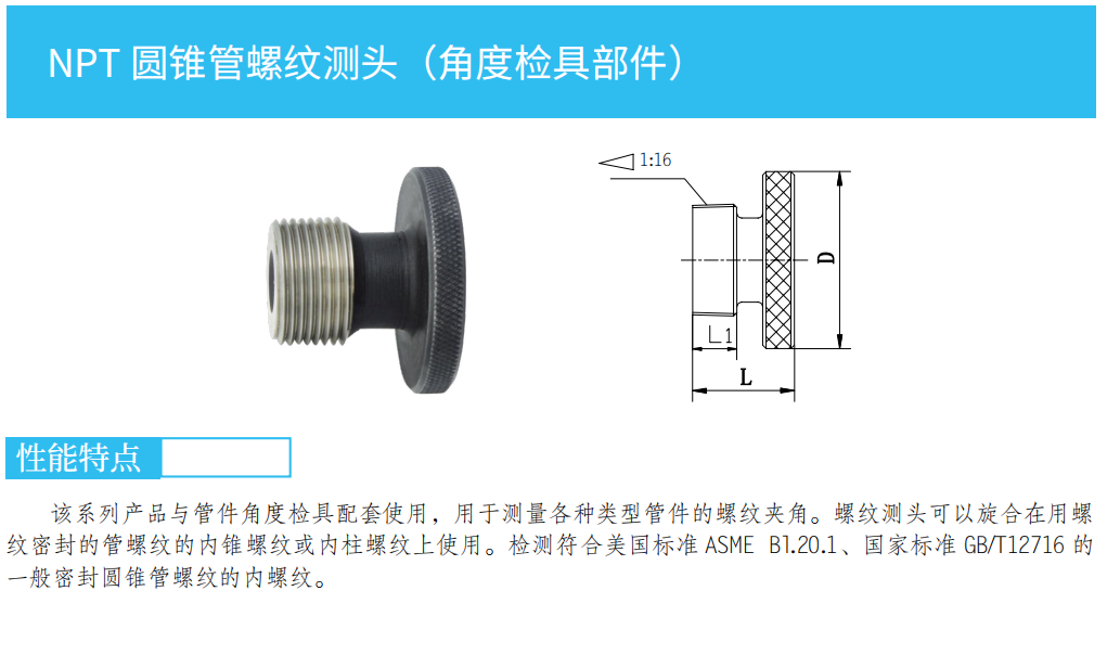 該系列產(chǎn)品與管件角度檢具配套使用,用于測量各種類型管件的螺紋夾角。螺紋測頭可以旋合在用螺紋密封的管螺紋的內(nèi)錐螺紋或內(nèi)柱螺紋上使用。檢測符合美國標準 ASME B1.20.1、國家標準 GB/T12716 的一般密封圓錐管螺紋的內(nèi)螺紋。