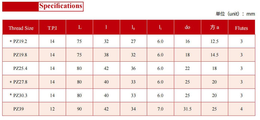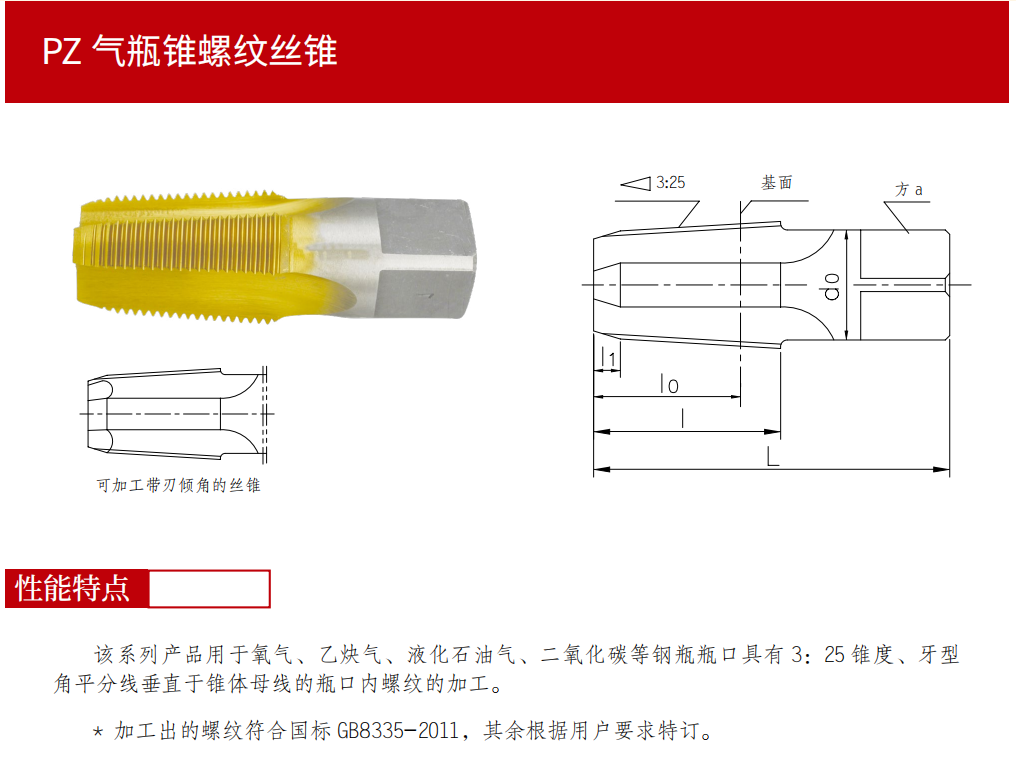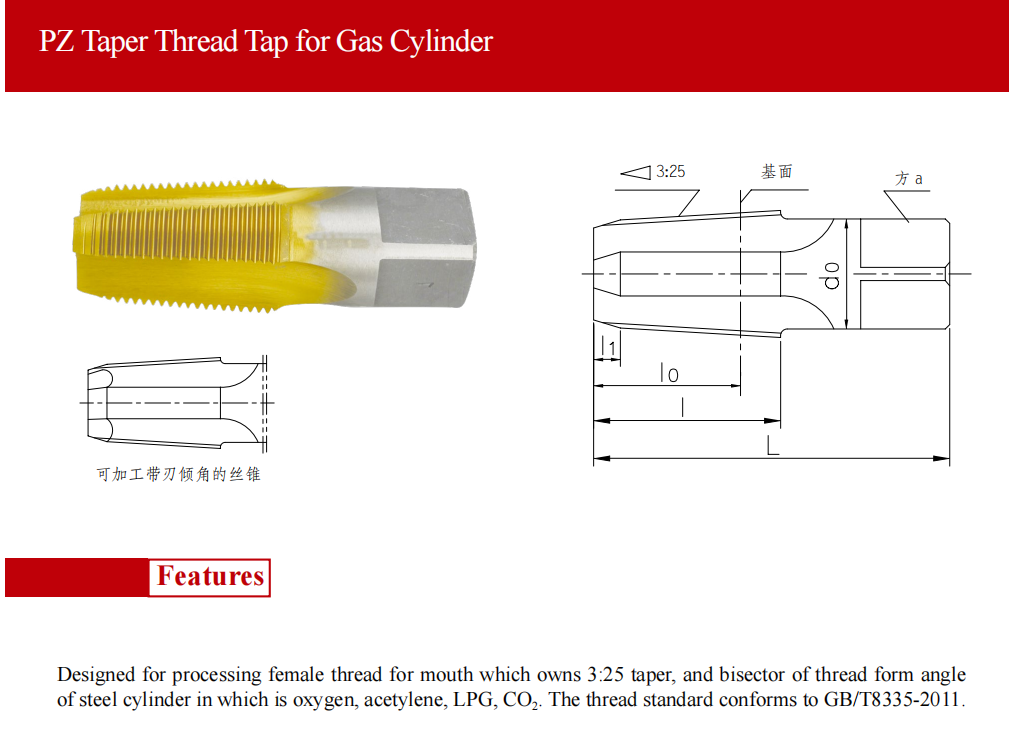 該系列產(chǎn)品用于氧氣、乙炔氣、液化石油氣、二氧化碳等鋼瓶瓶口具有 3:25 錐度、牙型角平分線垂直于錐體母線的瓶口內螺紋的加工。 加工出的螺紋符合國標 GB8335-2011,其余根據(jù)用戶要求特訂。