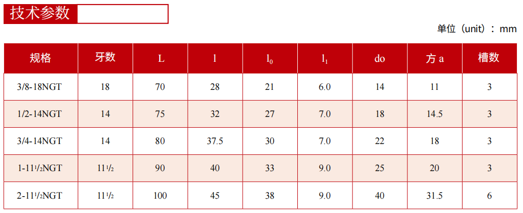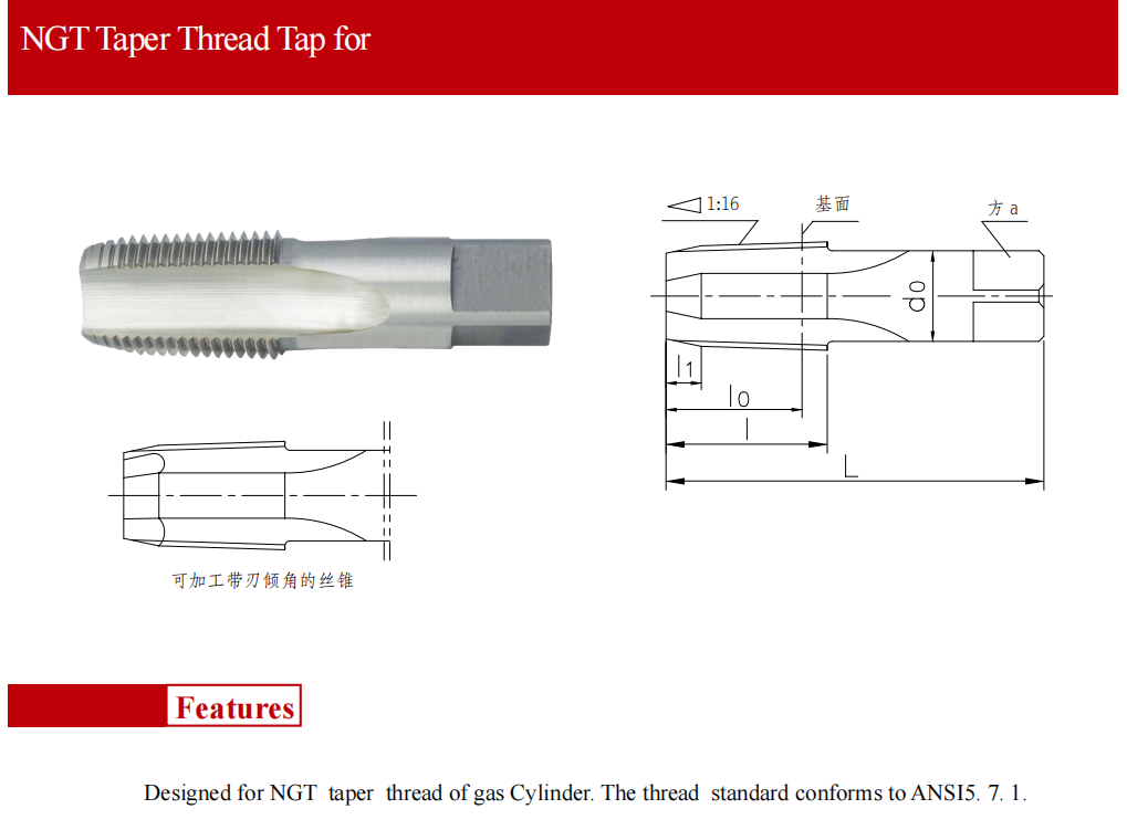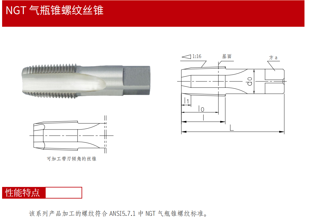 該系列產(chǎn)品加工的螺紋符合ANSI5.7.1中NGT氣瓶錐螺紋標(biāo)準(zhǔn)。