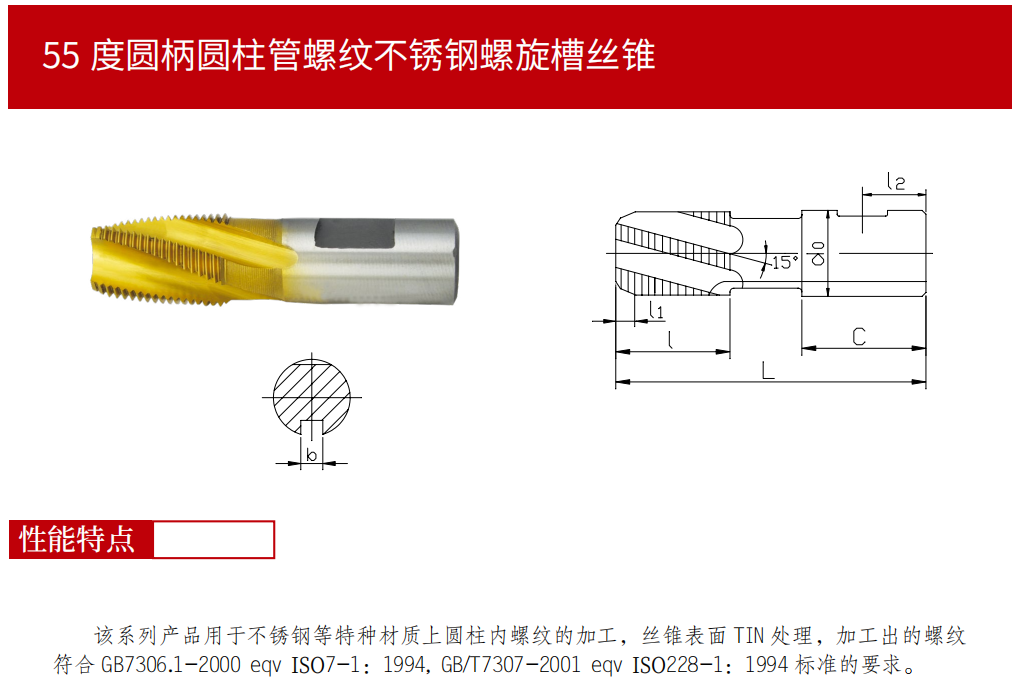 該系列產(chǎn)品用于不銹鋼等特種材質(zhì)上圓柱內(nèi)螺紋的加工,絲錐表面TIN處理,加工出的螺紋符合GB7306.1-2000 eqv ISO228-1:1994,GB7307-2000 eqv ISO228-1: 1994標(biāo)準(zhǔn)的要求。