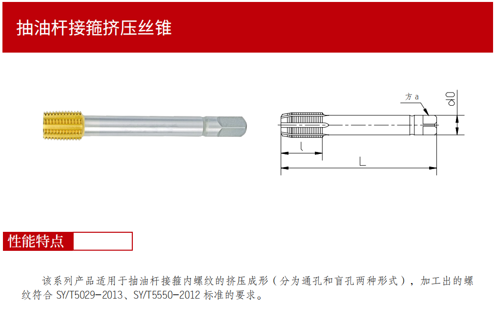 該系列產(chǎn)品適用于抽油桿接箍內(nèi)螺紋的擠壓成形(分為通孔和盲孔兩種形式),加工出的螺紋符合 SY/T5029-2003、SY/T5550-2006標(biāo)準(zhǔn)的要求。