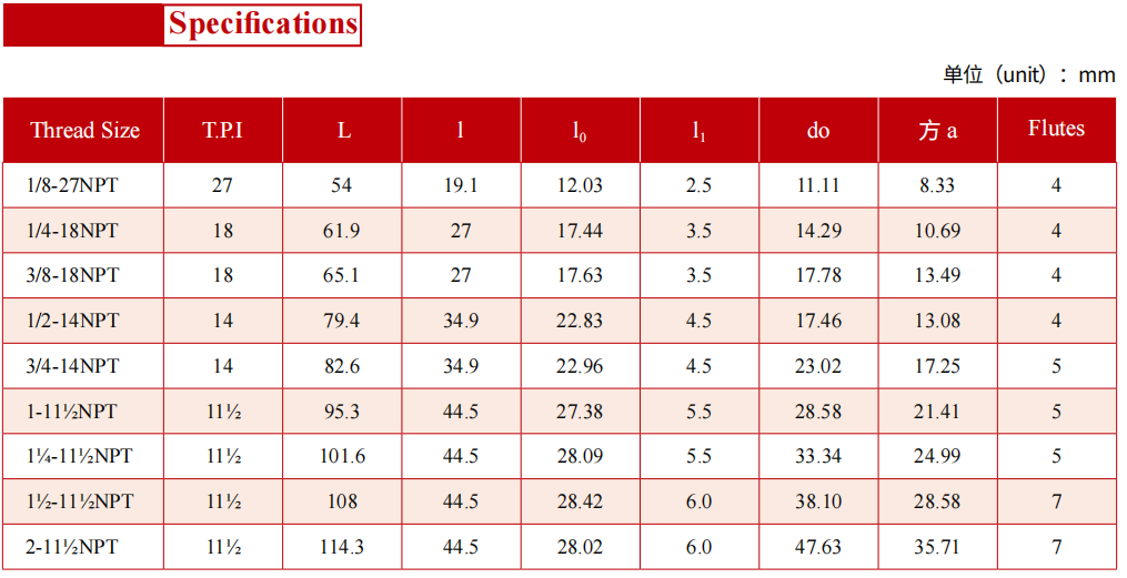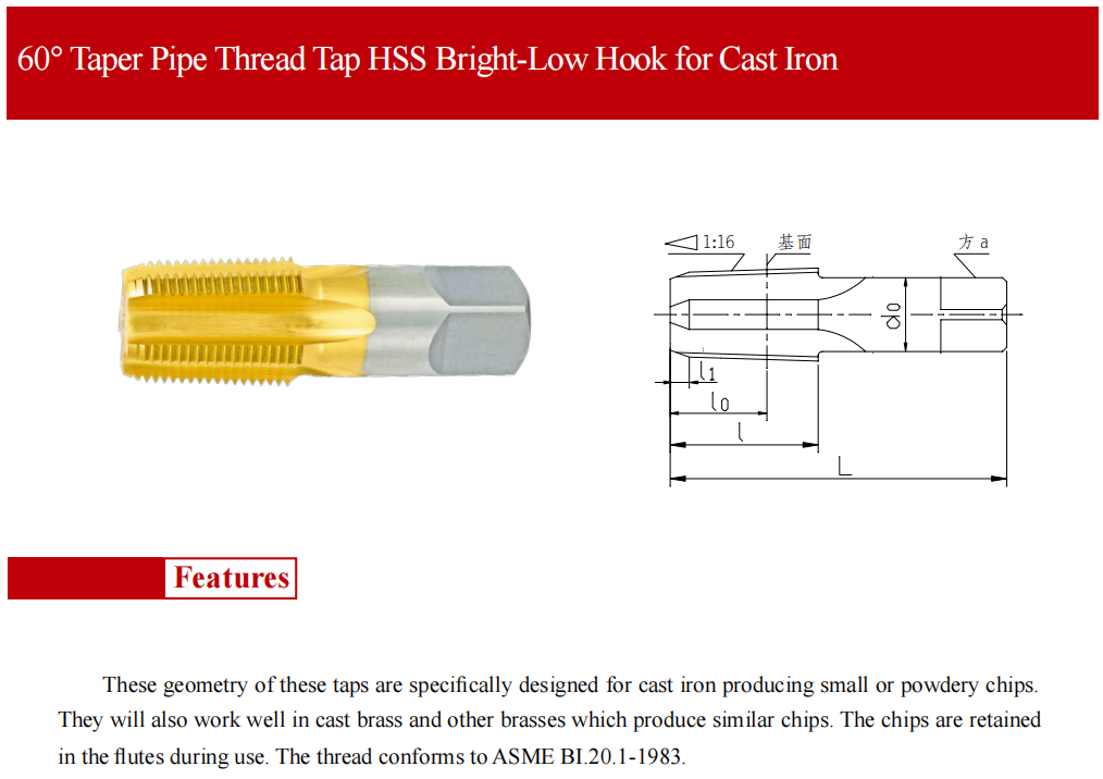 該系列產(chǎn)品適用于美制螺紋密封的圓錐管螺紋內(nèi)螺紋的加工,可用于加工球鐵件加工的螺紋,符合GB/T12716-2011 eqv ASME B1.20.1-1983標(biāo)準(zhǔn)的要求。