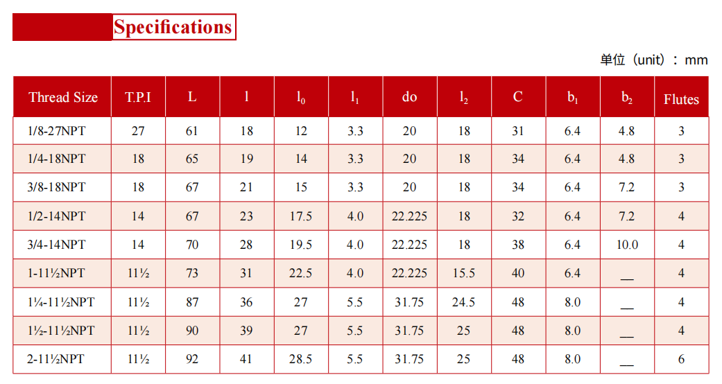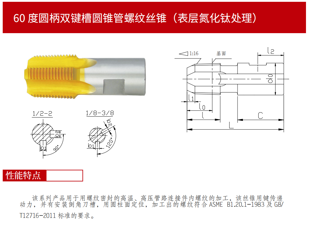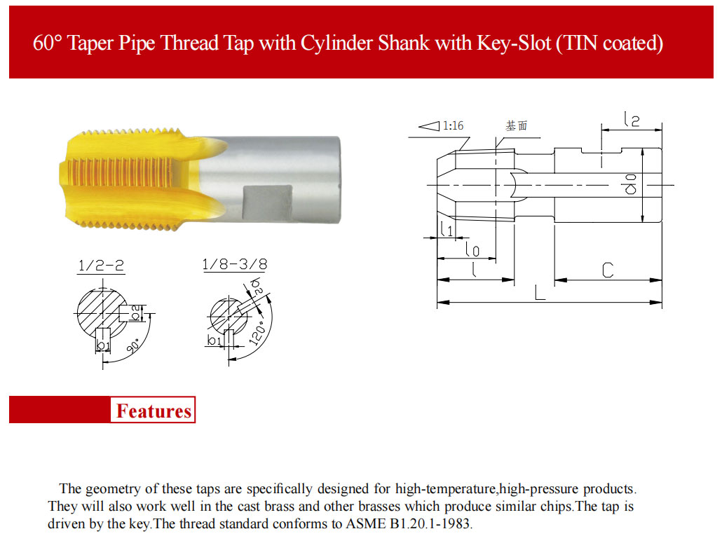 該系列產(chǎn)品用于用螺紋密封的高溫、高壓管路連接件內(nèi)螺紋的加工,該絲錐用鍵傳遞動力,并有安裝倒角刀槽,用圓柱面定位,加工出的螺紋符合ASME B1.20.1-1983及 GB/T12716-2011 標(biāo)準(zhǔn)的要求。