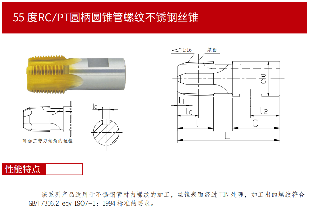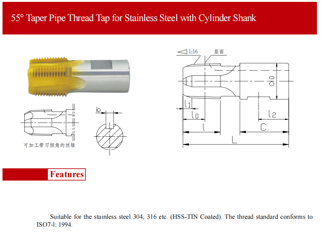 該系列產(chǎn)品適用于不銹鋼管材內(nèi)螺紋的加工,絲錐表面經(jīng)過(guò)TiN處理,加工出的螺紋符合 GB/T7306.2 eqv IS07-1:1994 標(biāo)準(zhǔn)的要求。