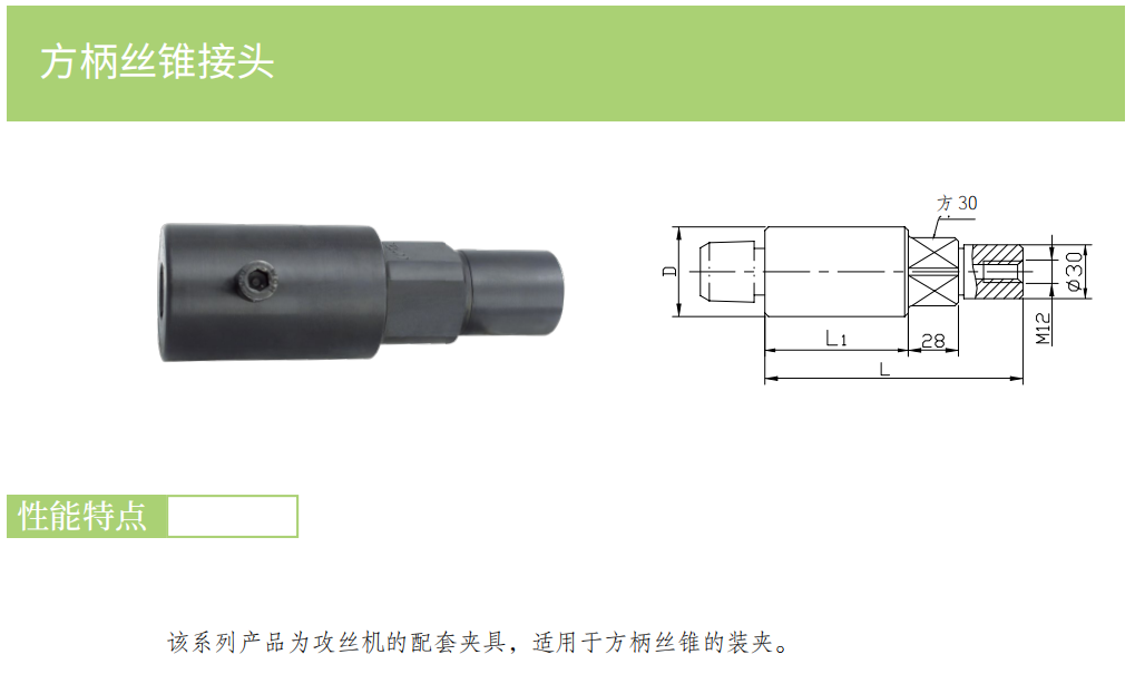 該系列產(chǎn)品為攻絲機(jī)的配套夾具,適用于方柄絲錐的裝夾。