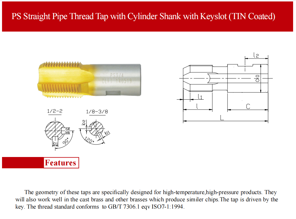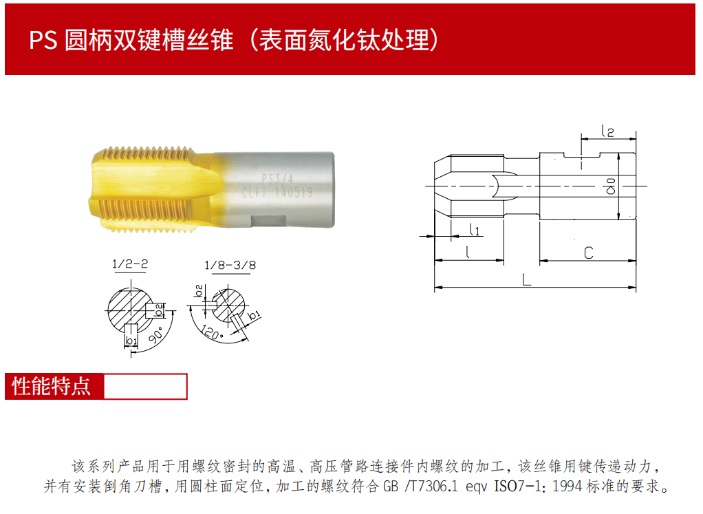 該系列產(chǎn)品用于用螺紋密封的高溫、高壓管路連接件內(nèi)螺紋的加工,該絲錐用鍵傳遞動力,并有安裝倒角刀槽,用圓柱面定位,加工的螺紋符合GB/T7306.1 eqv ISO7-1:1994標準的要求。